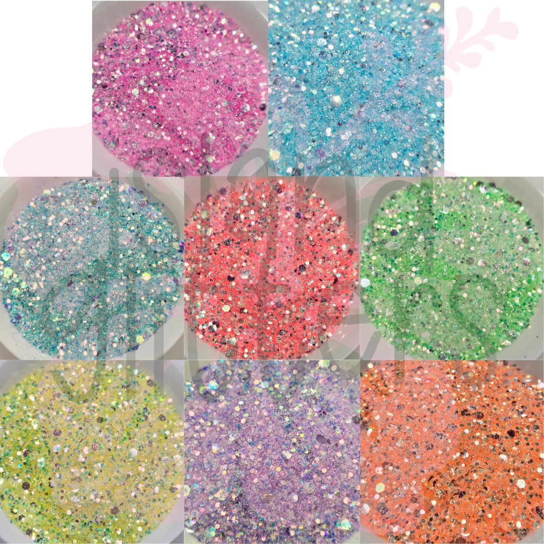 If the glitters you want are not available in bottles, but you would like it bottled, please add this to your order: Empty Bottles